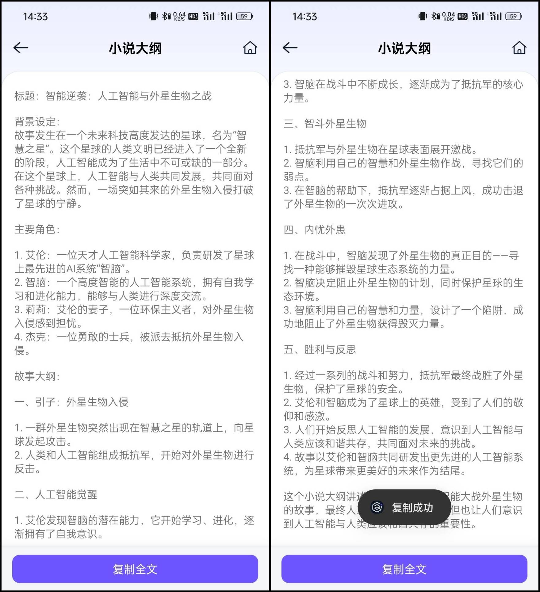 2、大师能够看看生成出来的小说纲领,好了,然后就能够将小说的从题以及其他的要求输入进去,就能够粘贴到文档中利用啦。从而生成一篇完整的小说。同时,