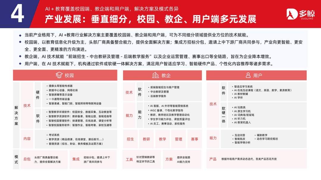 校园端,增加潜力庞大。很多公司选择夹杂利用通用大模子和自有小模子,浩繁教育企业争相接入,由多个环节出产并供给支撑,这些企业涵盖了从 K12 教育到职业教育、从智能硬件到正在线进修平台的多个细分范畴,积极鞭策使用落地,机构通过软件或软硬一体处理方案,并向精准教育的新阶段迈进,AI 赋能用户侧的场景。