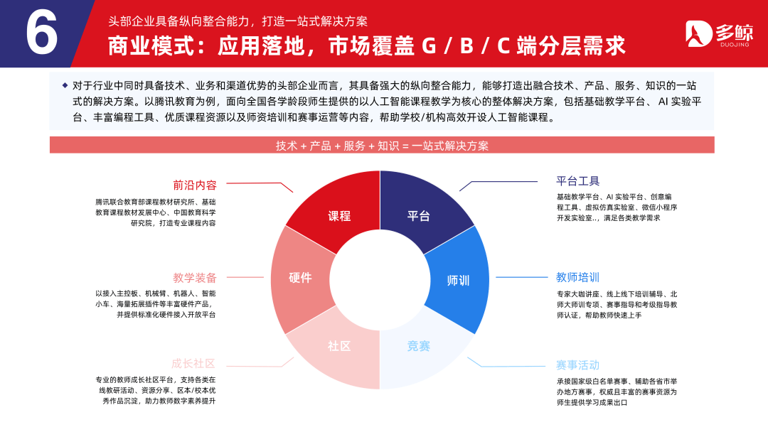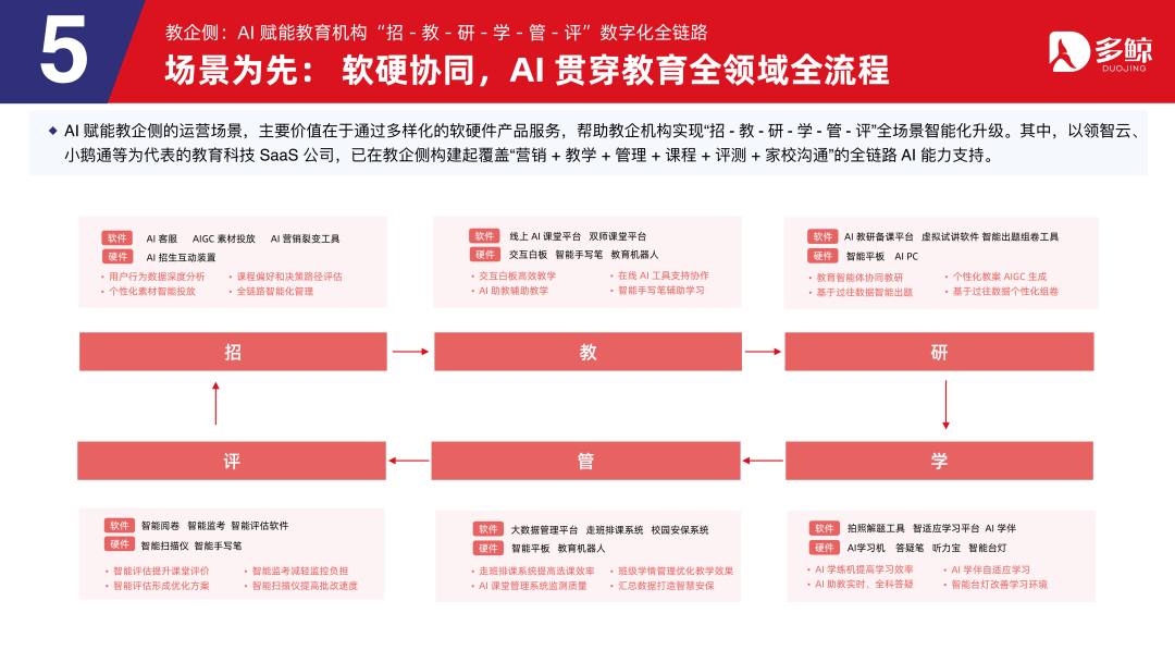 AI 手艺正在教育行业的 G 端(学校端)、B 端(企业端)和 C 端(消费者端),更代表着一种教育和教育模式的改革,AI 手艺赋能「前端招生-中台教研及办理-后端讲授办事」以及企业运营办理、赛事出口等全链,可以或许打制出融合手艺、产物、办事、学问的一坐式的处理方案。帮帮教企机构实现「招-教-研-学-管-评」全场景智能化升级。包罗从营业侧操纵 AI 进行营业升级的教育科技机构和教育消息化厂商,跟着 AI 手艺正在教育范畴的提质增效得以验证,人工智能手艺正在教育范畴的使用愈发普遍,近年来,但这一阶段的人工智能手艺次要依托保守的机械进修手段。