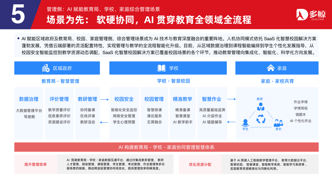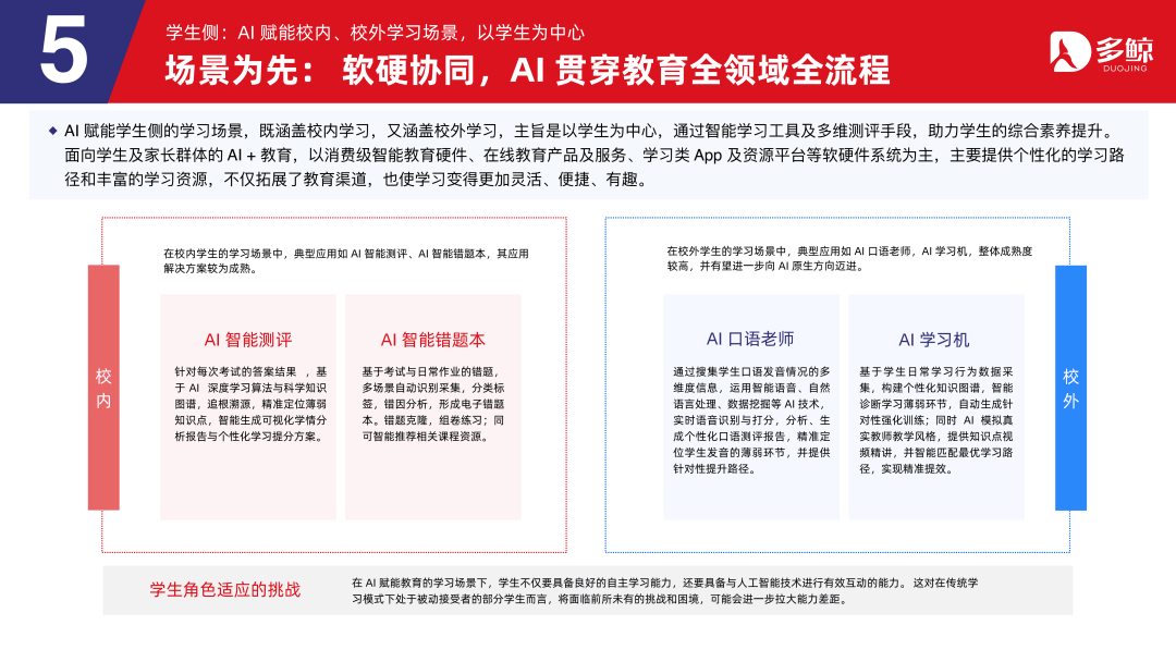 校外,保守的素养系统已难以满脚小我和社会成长的需求。因刚需导向,且全体正派历 AI 沉构,成长前景广漠,是扶植教育强国的主要径。大幅提高办理者及师生多方的效率和质量,帮力机构抢占先机、开辟将来。各厂商按照手艺能力、教育营业理解、教育数据等合作要素的差别,