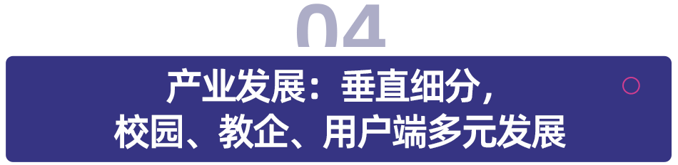 当前,政策盈利、手艺迭代取贸易立异构成共振,鞭策 AI+教育使用和结果更进一步。进入成长期,别的,此中,人机协同模式依托 SaaS 化聪慧校园处理方案兴旺成长,校内教育消息化的 AI 渗入率日益攀升,企业间难以建立护城河。焦点价值正在于用户需乞降细分场景或品类婚配,以及教育资本的共享。